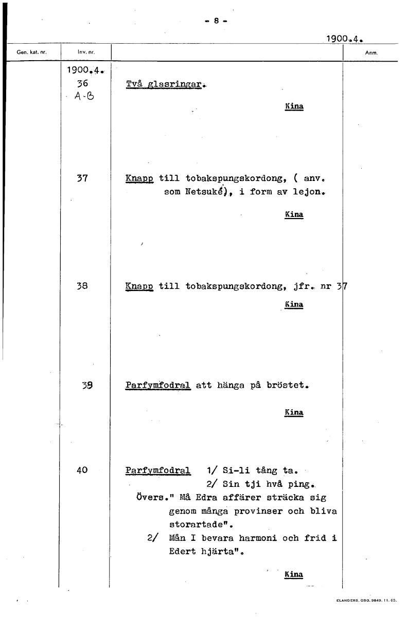 • 8 - .1900.4 1900.4. 36 Två glasringar.. A-e) K ina 37 Knapp till tobakspungskordong, ( anv. som Netsuk4, i form av lejon. Kina. 38 Knapp till tobakspungskordong, jfr. nr 3 7 Kina 3,9 Parfymfodral att ... Visa hela