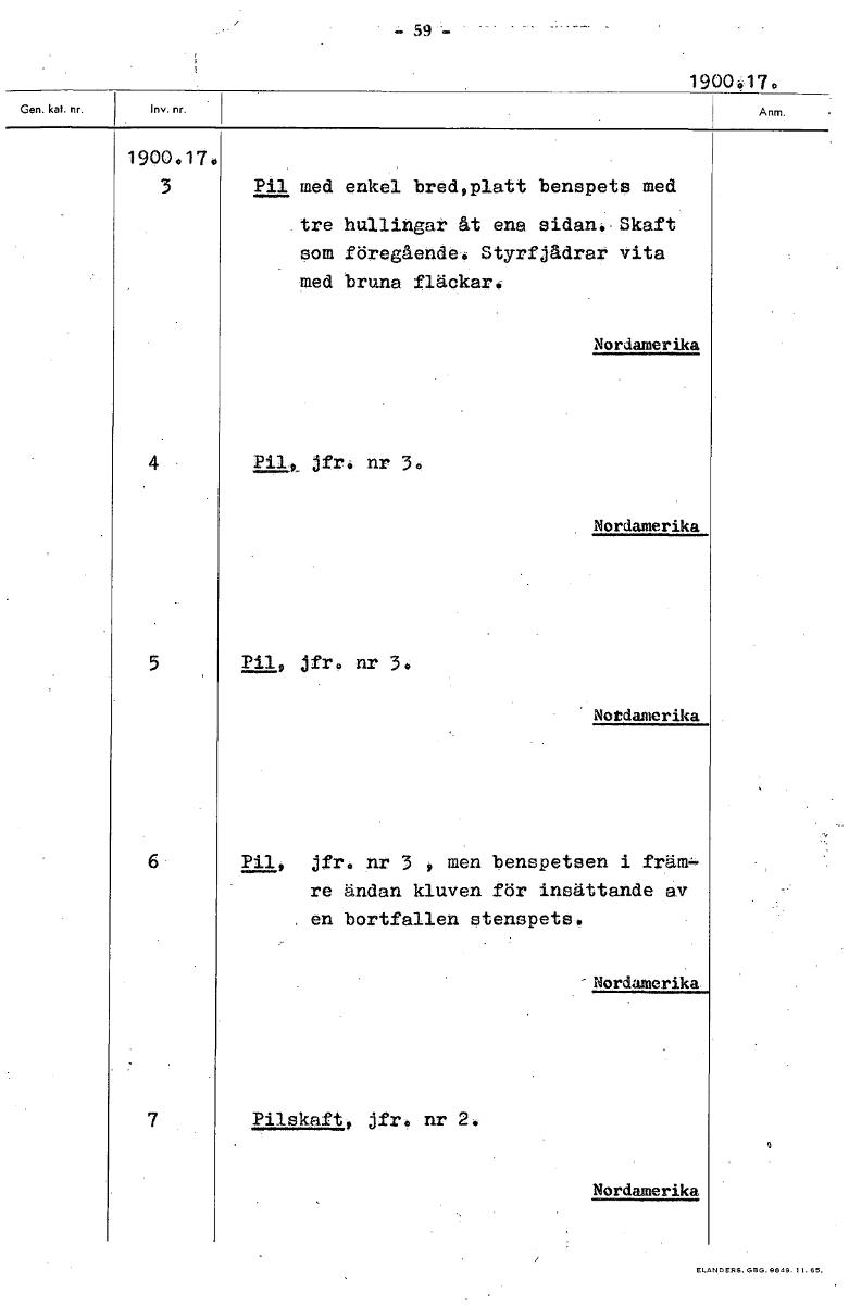 • 19004170 1900.17. 3 Pil med enkel bred,platt benspets med tre hullingar åt ena sidan. Skaft som föregående. Styrfjådrar vita med bruna fläckar: 4 jfr. nr 3 5 Pil, jfr. nr 3. 6 Pil, jfr. nr 3 men bensp... Visa hela
