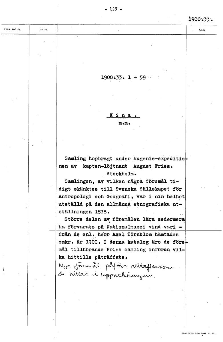 -123- 19001331, 1900.33. 59 Kina.. m.m. Samling hopbragt under Eugenie-expeditio nen av kapten-löjtnant August Fries. Stockholm. Samlingen, av vilken några föremål ti digt skänktes till Svenska Sällsk...Visa hela