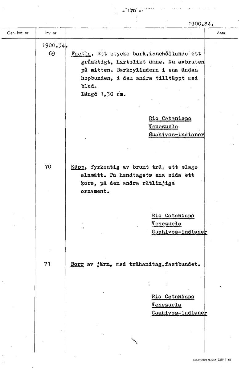 170 - 1900.34. 1906.34. 69 Fackla. Ett stycke barkeinnehållande ett gråaktigt, hartslikt ämne. Nu avbruten på mitten, Barkcylindern i ena ändan hopbunden, i den andra tilltäppt med blad. Längd 1,30 cm. Rio Catanieue Venezuela Guahivos-indianer 70 Käpp, fyrkantig av brunt trä, ett slags alnmått. På handtagets ena sida ett kors, på den andra rätlinjiga ornament. Rio eataniaDo Venezuela Guahivos-indiane 71 Borr av järn, med trähandtag,fastbundet. Rio Cataniapo Venezuela Guahivosindiane [ocr]