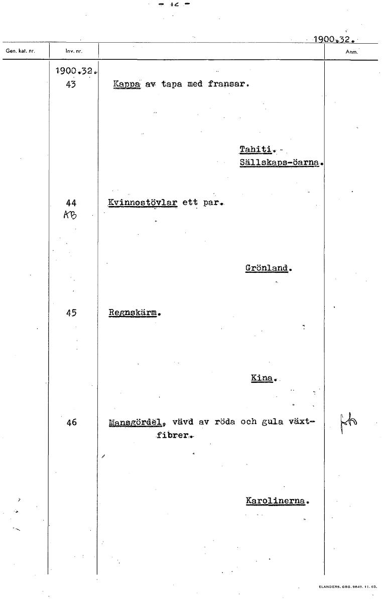 • 1900.32. 1900.32. 43 Kapl....aa av tapa med fransar. Tabiti Sällskaps-öarna. 44 Kvinnostövlar ett par. Kg • Grönland. 45 Regnskärm. Kina 46 Mans:gördel:9. vävd av röda och gula växt, fibrer.. Karoline... Visa hela
