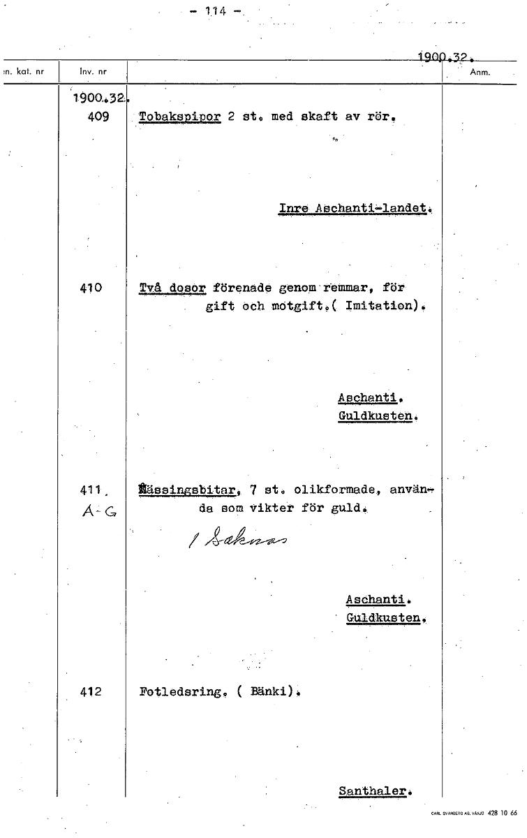 114 ,. 90P.P. 190(432 409 TobaksDipor 2 st. med skaft av rör. %, Inre Aschanti-landet. 410 Två dosor förenade genom remmar, för gift och motgift.( Imitation). Aschanti. Guldkusten. Usingsbita•, 7 st0 ...