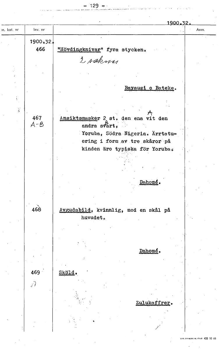129 1900.3 1900,32 466 "Hövdingknivar" fyra stycken. L Bayauzi o Bateke. 467 Ansiktsmasker 2 et. den ena vit den A - andra askirt.. Yöruba, Södra Nigeria. Ärrtatu- ering i ferm ,av-.tre skåror -på kinden äro typiska för Yoruba4 Dahoig, 468 Avgudabild, kvinnlig, med en skål på huvudet, Dahomg. 469 Sköld. Zulukaffrer, [ocr]