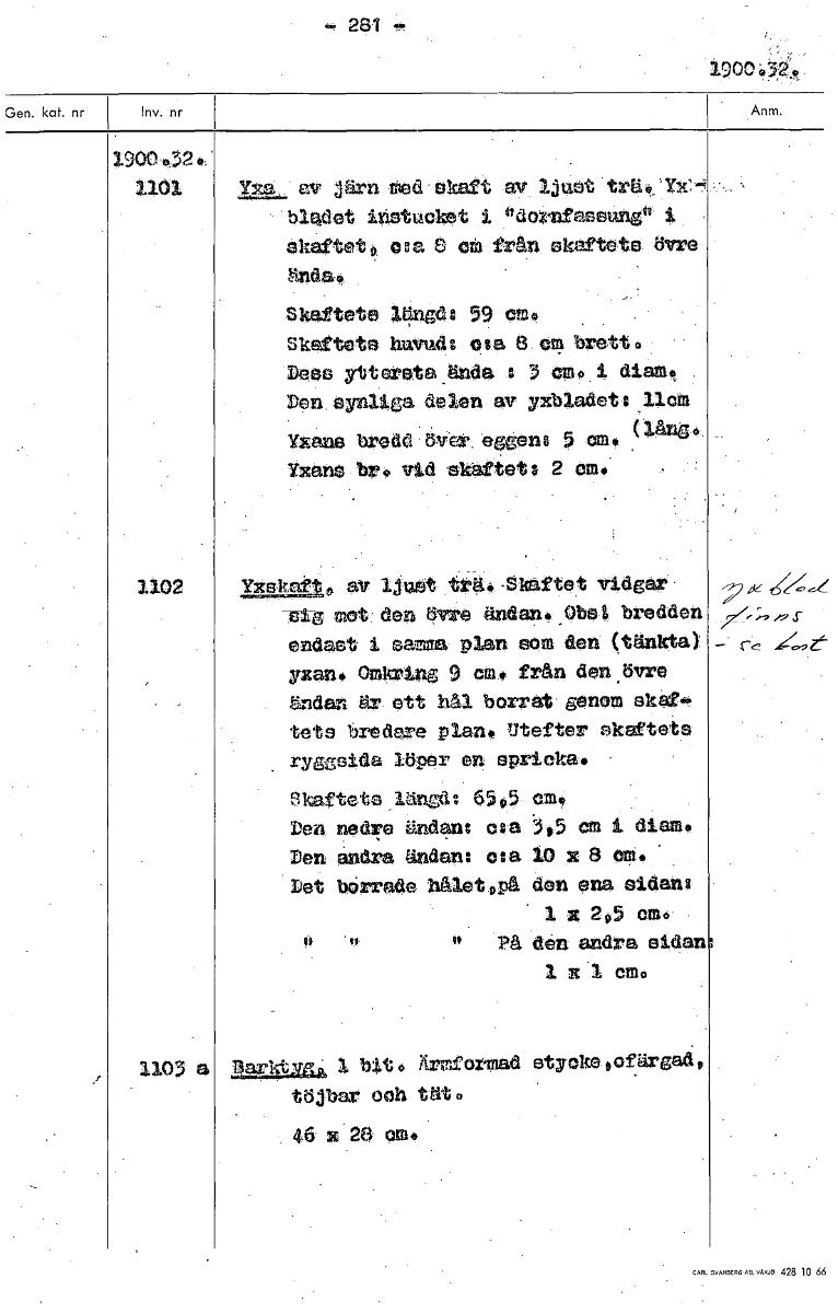 4, 281 1900O3, 1900.20.' 1101 Yxa av järn med skaft av ljust trä. Yxbladet instucket i "dornfassung" i skaftet c:a 8 om från skaftets övre ända. Skaftets längd: 59 cm. Skaftets huvud: ca 8 cm brett. Dess yttersta ända : 3 cm i diam. Den synliga delen av yxbladet; 11 cm lång. Yxans bredd över eggen: 5 cm Yxans bredd vid skaftet: 2 cm. 1102 1,321...ttat av ljust träö -Skaftet vidgar y .t(4L AYLig mot: den övre ändanoObel bredden endast i sa nian som den (tänkta) re. e Yxan. Omkring 9 cm, från den övre ändan är ett hål borrat genom skat., tets bredare plan, Utefter skaftets ryggsida löper en spricka. Skaftetelängd: 6595 cm, Den nedre ändan: c:a 3,5 cm i diam. Den andra ändan: c:a 10 x 8 cm. Det berrade hålet9på den ena sidan: 1 x 295 om. 0 På den andra sidan 1 x 1 cmo 1103 a 1 bit rmformad etyckeofärgad9 töjbar och tät. 46 x 28 om. [ocr]