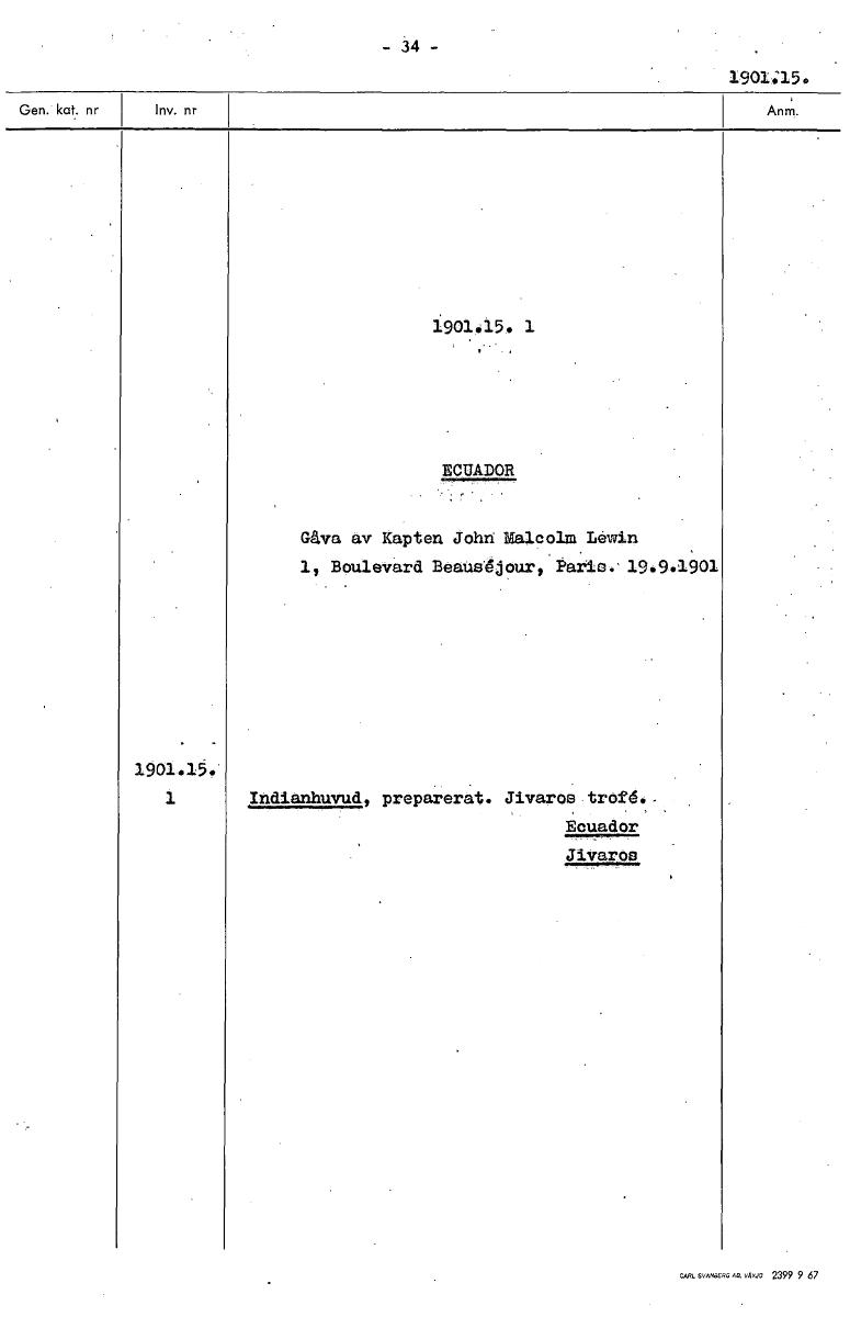 • -34- 1901;154 1901.15. 1 ECUADOR Gåva av Kapten John Malcolm Lewin 1, Boulevard Beauséjour, Paris. 19.9.1901 190115. 1 Indianhuvud, preparerat. Jivaros trofé.- Ecuador Jivaros [ocr]