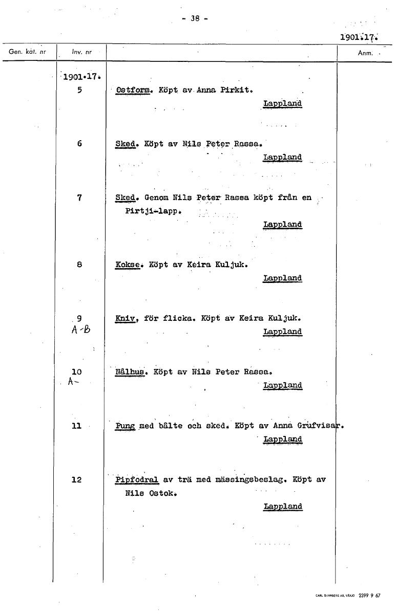 • - 38 - 1901:17: 1901.17. 5 .CetforM. Köpt av. Anna Pirkit. Lappland 6 Sked. Köpt av Nils Peter.Rassa. Lappland 7 Sked. Genom Nils peterRassa köpt från en Pirtjiä-lapp. Lappland 8 Bokve. Köpt av Keira ... Visa hela