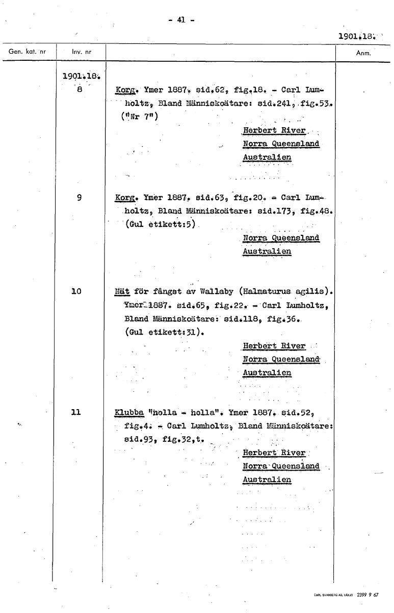 - 41 - 1901:18: 19010.8: 8 Korg. Ymer 1887, sid.62, fig.18. - Carl Lum- holt% Bland Människoätare: sid0241,fig.534 (1Nr 7") Hörbert.River Norra Queensland Australien 9 Korg. Ymer 1887. sid.63,fig.20. ...