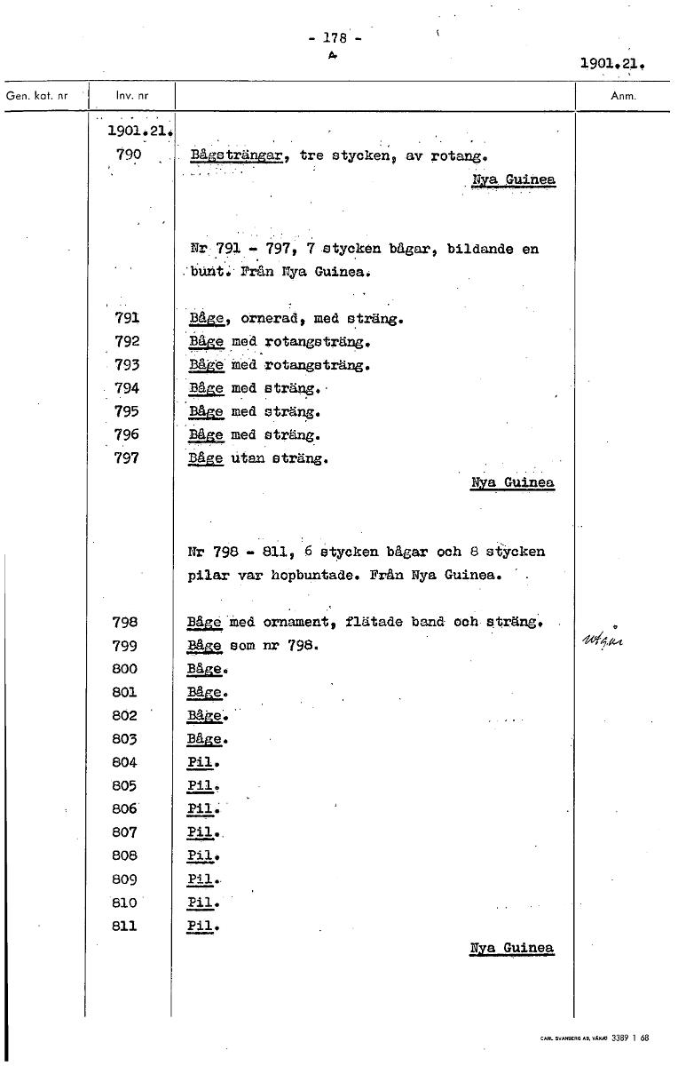- 178 1901.21. 1901.21. 790- bågsträngar, tre stycken, av rötans. kVa Guinea Nr:791«. 797, 7 stycken bågar, bildande en bUht:.Prhn Nya Guinea. 791 24, strierad, med sträng. 792 Båge med rotangsträng, ...