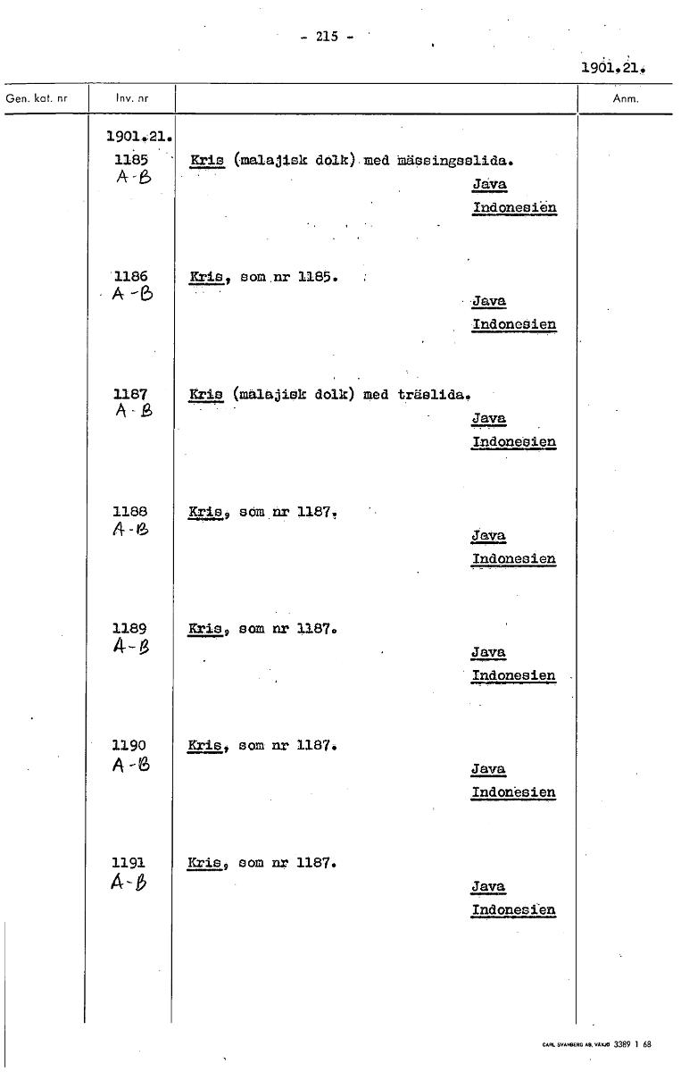 • - 215 - 1961.21. Kris (malajisk dOlk).med bässingsslida. Java Indonesien 1186 Kris, som nr 1185. •lava Indonesien 1187 Kris malajisk dolk) med träslida. A - Java Indonesien 1188 Kris som nr 1187. A- -... Visa hela