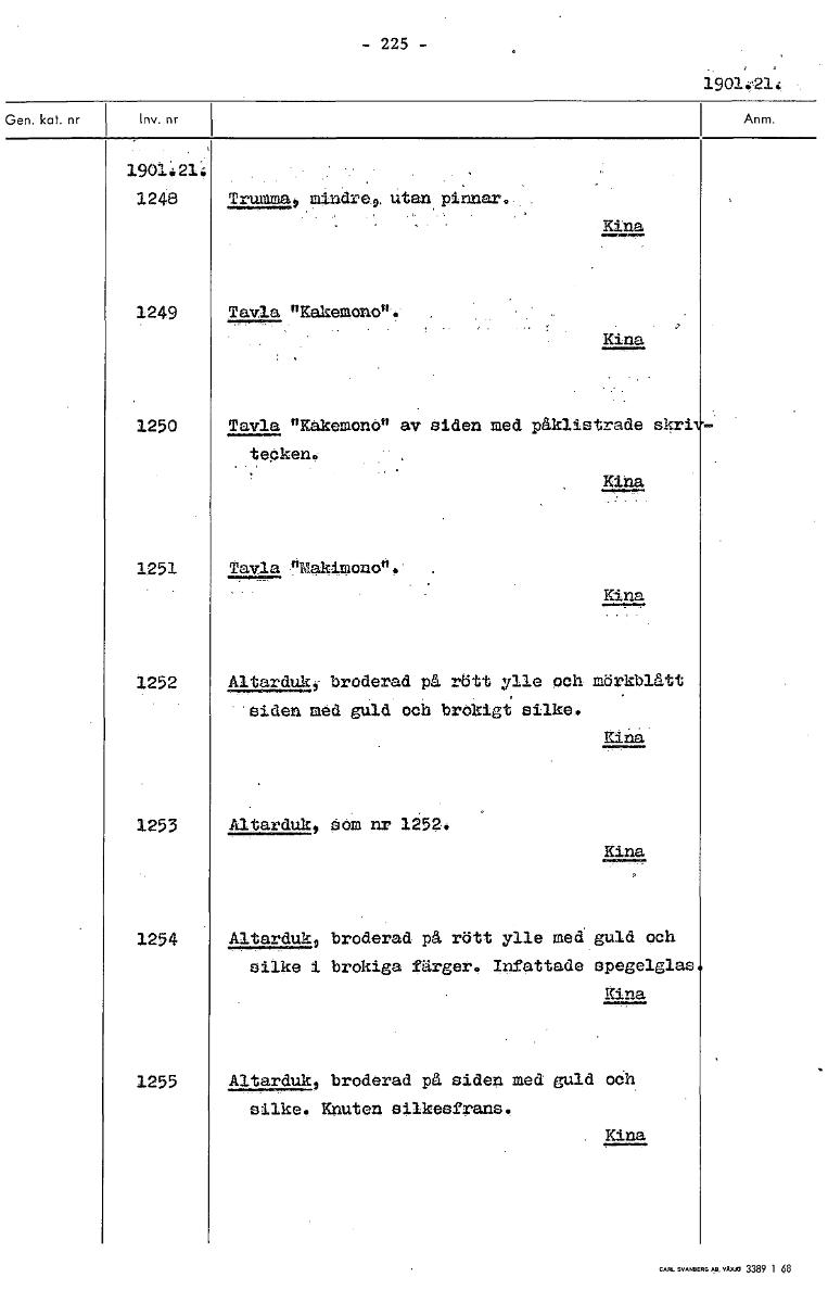 - 225 - 190421. 190i 21. 1248 Trumma mindre, utan pinnar. Kina 1249 Tavla "Kakemen0". Kina 1250 - Tavla "Kakemono av siden med påklistrade skri tecken. Kina 1251 Tavla •"Lakimonon. Kina 1252 Altarduk, broderad på rött ylle och mörkblått siden med guld och brokigt silke. Kina 1253 Altarduk, som nr 1252. Kina 1254 Altarduk, broderad på rött ylle med guld och silke i brokiga färger. Infattade spegelglas Kina 1255 Altarduk, broderad på siden med guld och silke. Knuten silkesfrans. Kina [ocr]Stäng