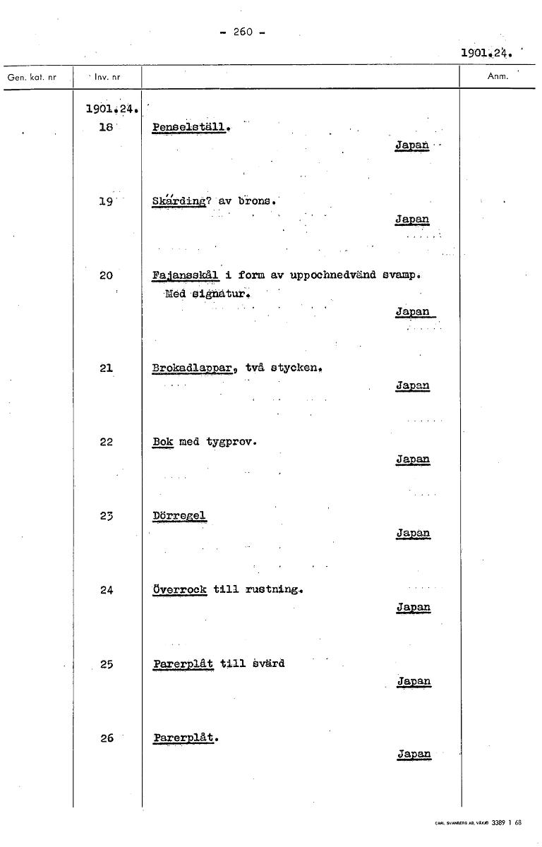 • - 260- 190144. 1901 .24. 18 PeneeIställ. Japan - 19 Sicrdin? av bi.Ons. Japan, 20 Fajansskål i form av uppOchnedvänd svampi Med Signatur Japan 21 Brokadlappars två stycken. Japan, 22 Bok med tygprov. ... Visa hela