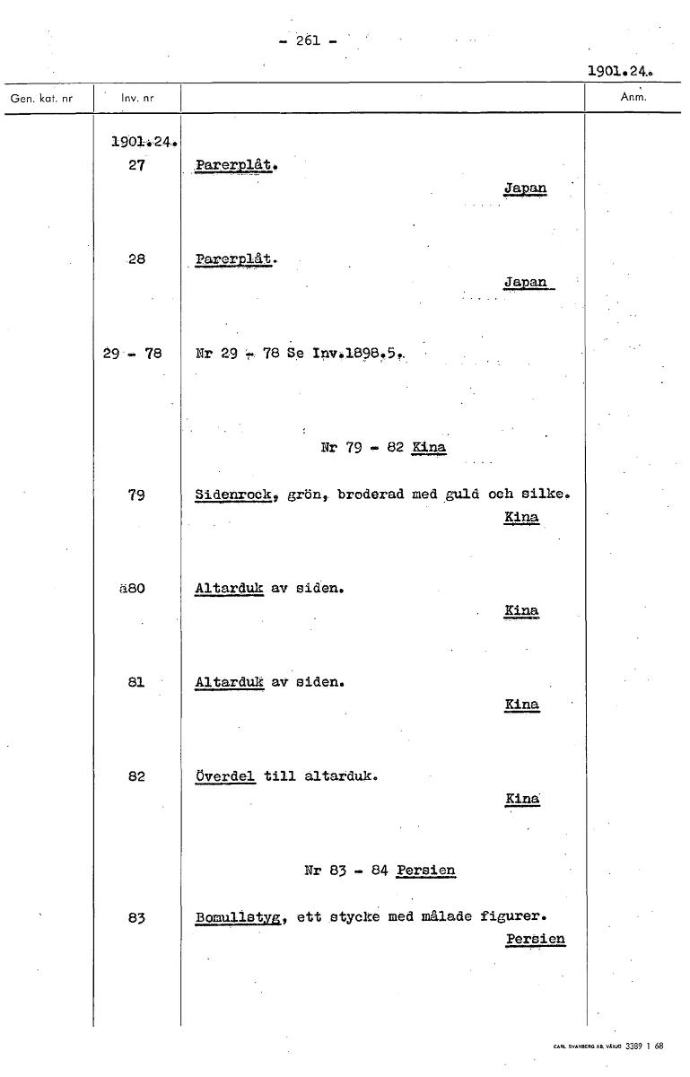 • - 261 - 1901.24.. 1901424. 27 .Parerplåt. Japan .28 Japan 29-78 Nr 29 78 Se Inv.1898.5.. Nr 79 82 Kina 79 Sidenrock grön, broderad med guld och silke. Kina ä80 Altarduk --- av siden, . Kina 81 Altardu... Visa hela