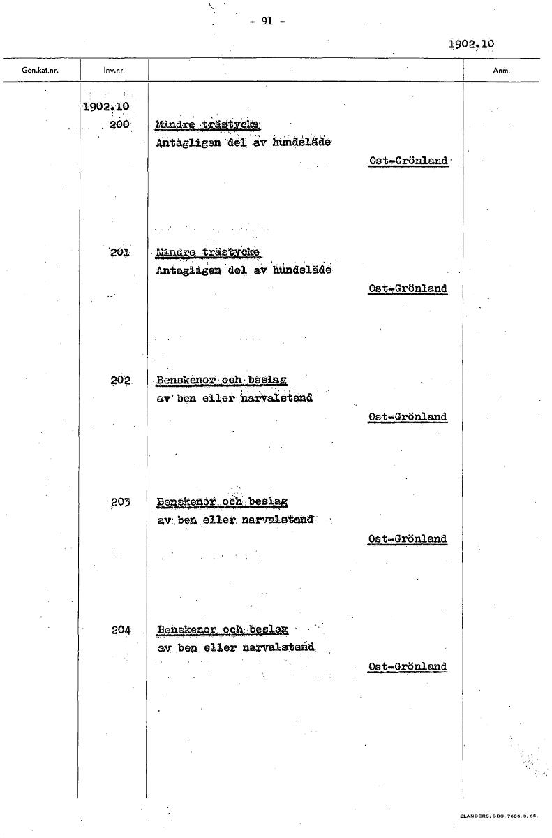 • - 91 - 1902.10 1902.10 „ '200 Mindre •träStåreles Antagligen del eviniiialeliide Ost-Grönland 201 • !andre. trästteke Antaglikien 'del av 'keniaelädie Ost-yGrönland 202 • Bensközlor,oeh.baslag av ben ... Visa hela