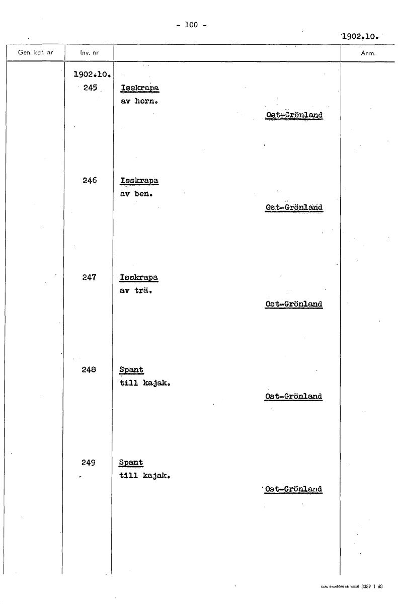 • - 100 - 1902.10. 1902.10. 245 IsskraPa av horn. Os .Grönland 246 Isskrapa av ben. Ost-Grönland 247 Isskrapa av trä. Ost-Grönland 248 Spant till kajak. Ost-Grönland 249 Spant till kajak. Ost-Grönland [... Visa hela