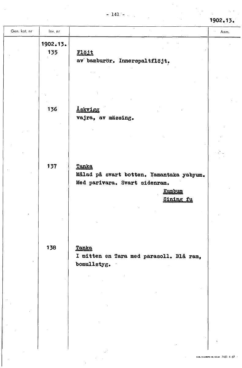 • — 141 — 1902 13. 1902:13. 135 FlOt av'bamburör. Innerepaltflöjt. 136 Åskvigg vajra, av mässing. 137 Tanka Målad på svart botten. Yamantaka yabyum. Med parivara. Svart sidenram. Kumbum Sinini fu 138 Ta... Visa hela