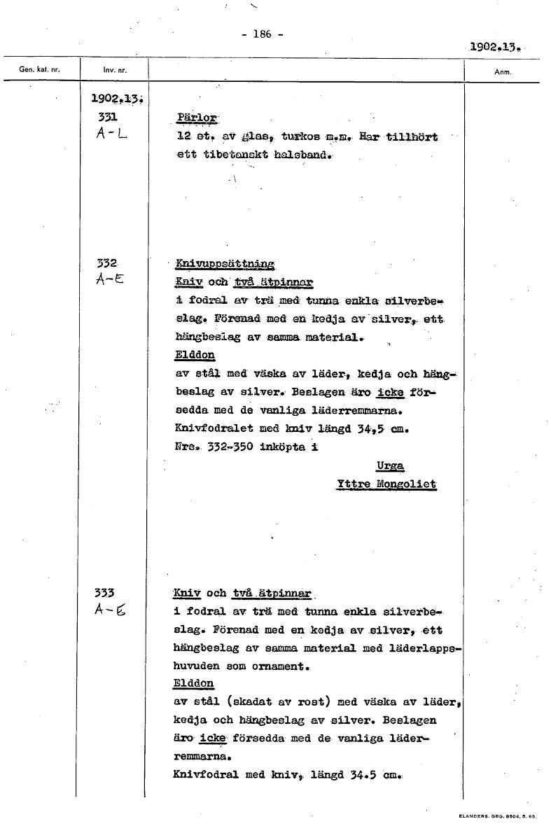 -186- 1902.13. 190243; 331 Färlore A-L 12 st, av:gg:rast_ turkos m.m.. Har tillhört ett tibetanskt halsband.. 332 KnivupPsättnin,‘ 7A- e Kniv och två ätpinnar fodral av trä .zned tunna enkla silverbe-...