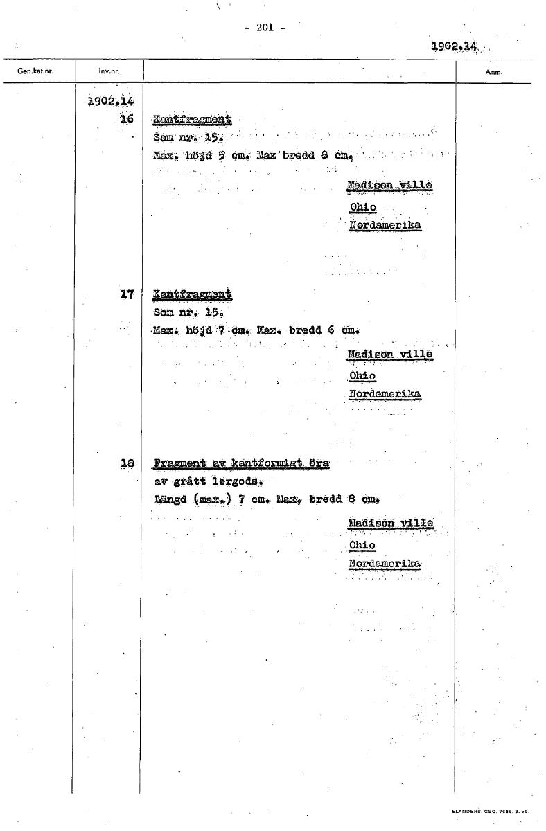 - 201 - 1902.44, .Nant2ragment SaM'arD 15.Mazie höffd 0m4', M brädd 6 om. Radiann -Villa Ohio 'kordainerika 17 Kamera Kanterament Som Ärt' 154. ,Maz; höja :7: nit, Mat, bredd Madieon ville Ohio Nordamerika 18 Fragment av. kantformigt_öra av grått Iörgödt4 'Ängd (m9-754.7 emo, maz4 brixid QW. Madiedn Ohio Nordamerika [ocr]