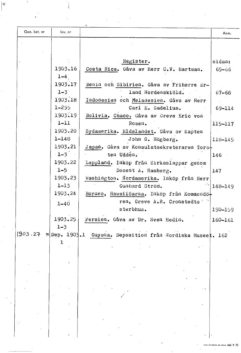 Register. sidan: 1903.16 Costa Rica. Gåva av Herr C.V. Hartman. 65-66 1-4. 1903.17 Benin och Sibirien. Gåva av Friherre Ir- 1-3' land Nordenskiöld. 67-68 1903.18 Indonesien och Melanesien. Gåva av Her...Visa hela