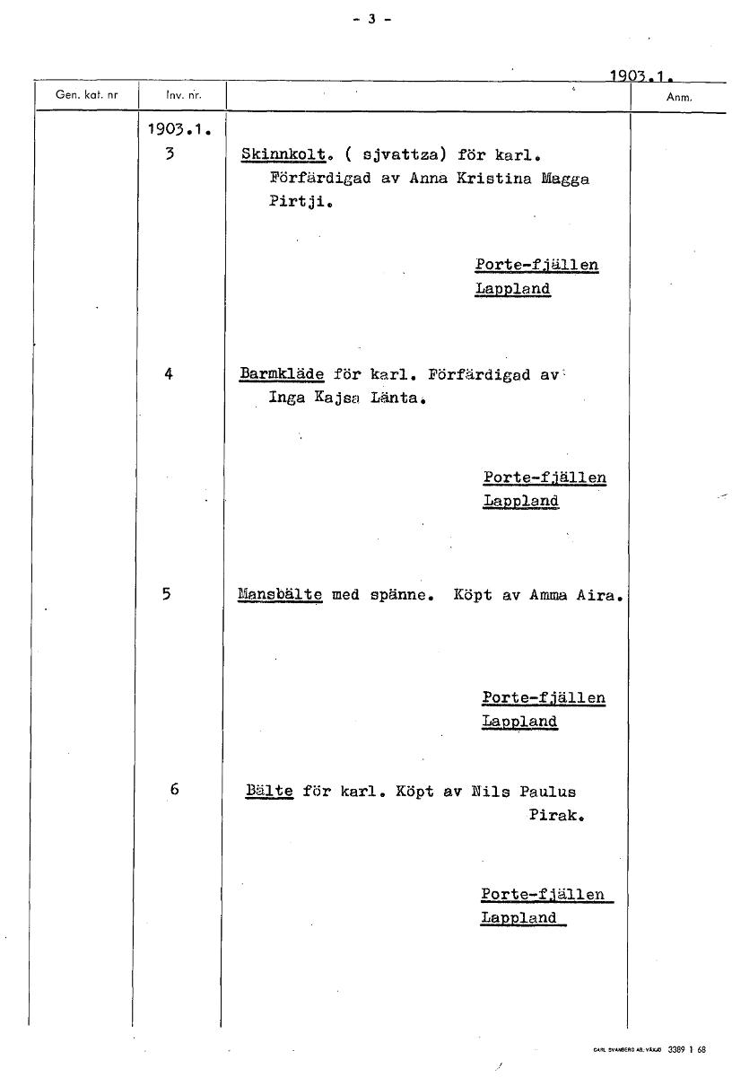 • 1903.1. 1903.1. 3 Skinnkolt. ( sjvattza) för karl. Förfärdigad av Anna Kristina Magga Pirtji. Porte-fjällen Lappland 4 Barmkläde för karl. Förfärdigad av Inga Kajsa Länta. Porte-fjällen Lappland, 5 Ma... Visa hela