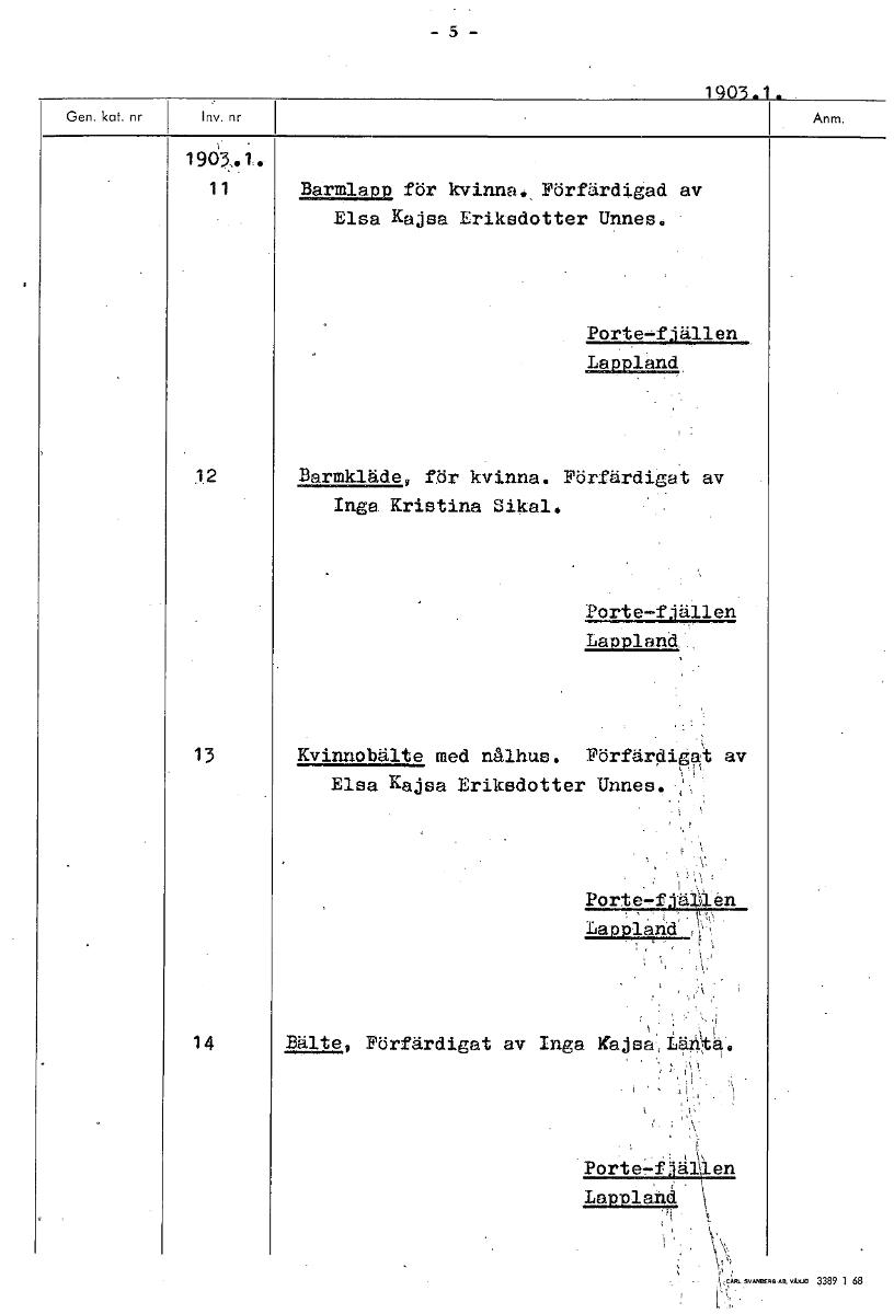• 1903.1. 1903,1. 11 Barmiapp för kvinna., Förfärdigad av Elsa Kajsa Eriksdotter Unnes. Portefjällen Lappland 1.2 Barmkläde9 för kvinna. Förfärdigat av Inga Kristina Sikal. Porte-fjällen Lappland, • 13 ... Visa hela
