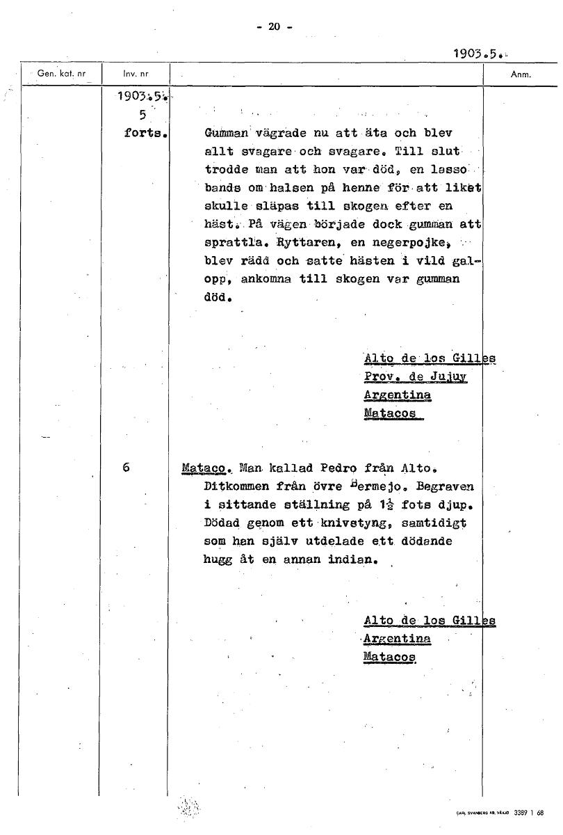 1903.5 190315. 5 forts. Gumman vägrade nu att äta och blev allt svagare och svagare. Till slut trodde man att hon var död, en lasso* bands om'halsen på henne för,att liket skulle släpas till skogen efter en häst. På vägen började dock gumman att sprattla. Ryttaren, en negerpojke, blev rädd och satte hästen i vild gal- opp, ankomna till skogen var gumman död, de los Gill Prov. de Jujuy Argentina MataCos 6 Mataco. Man, kallad Pedro från Alto. Ditkommen från övre bermejo. Begraven i sittande ställning på Fl fots djup. Dödad genom ett knivstyng, samtidigt som han själv utdelade ett. dödande hugg åt en annan indian. Alto de los Gill Argentina Matacos [ocr]