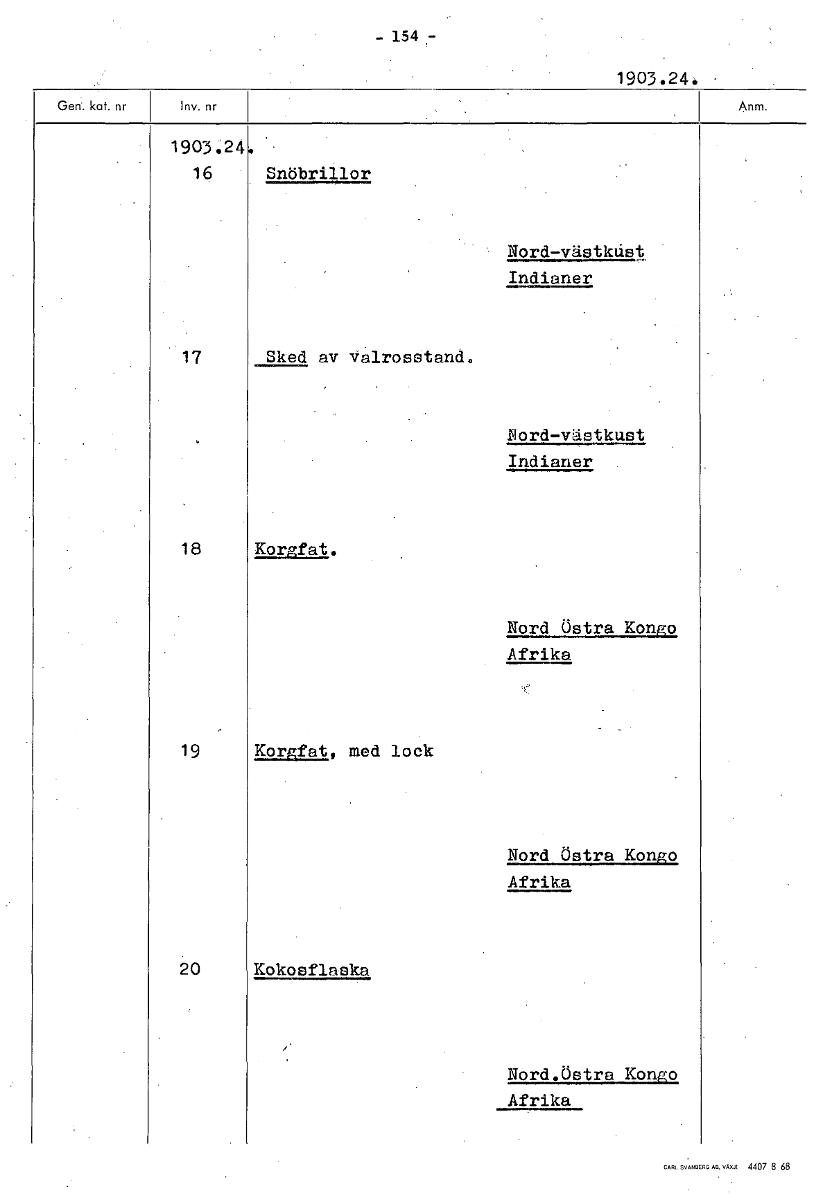 • - 154 1 903 . 2 4. 1903.24 16 Snöbrillor Nord-västkäst Indianer 17 Sked av valrosstand. Nord-västkust Indianer 18 Korgfat. Nord Östra Kongo Afrika 19 Korgfat, med lock Nord Östra Kongo Afrika 20 Kokos... Visa hela