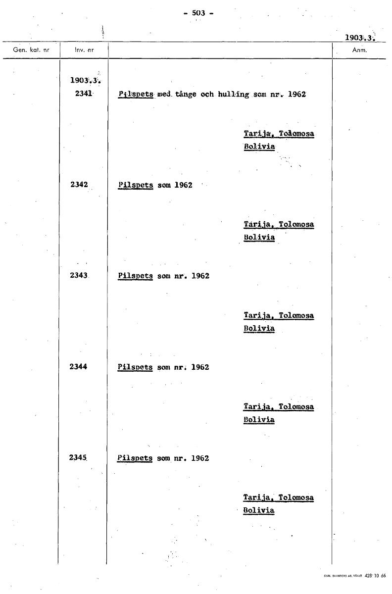 • - 503 - 1903'4. 2341. PO:spets, med. tånge och.huIlingsem nr., 1962 Tarija, Toåomosa Bolivia 2342 Pilspets som 1962 Tarija. Tolomosa Bolivia 2343 Pilspets som nr. 1962 Tarija. Tolomosa Bolivia 2344 Pi... Visa hela