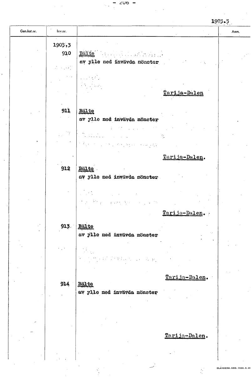 • 1905-.3 910 • • . ev ylle med invävda mönster Tarna-Dålen 911 Bälte av ylle med invävda Mönster Torna-Dalen. 912 Bälte av ylle med åvävda mönster Tarija-Dalen. 934- Bälte av ylle nöd in iida mönster T... Visa hela