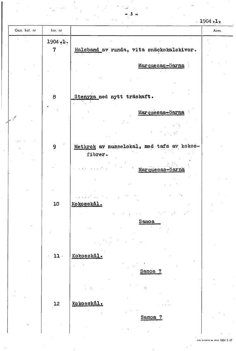 • 1904.1. 7 Halsband av runda9 vita snäokskalskivor. Marquesas.töarna 8 Stenyxa med nytt träskaft. Marquesas..öarna 9 Metkrok av musselskal mad tafs• av kokos- fibrer. ggrsuesas--tiarnä 10 Kokosskål. Sa... Visa hela