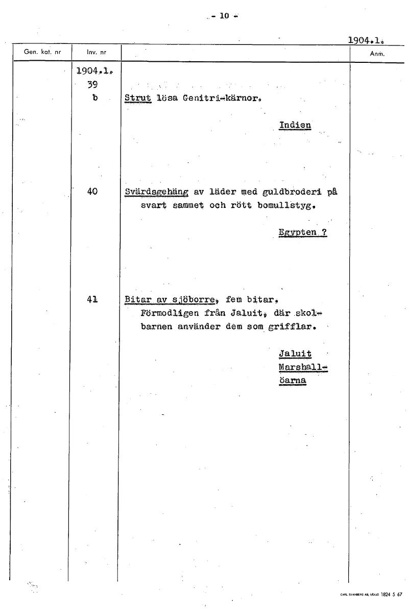 • 1904..14 1.904.10 3. b Strut lösa Genitri—kärnor. Indien 40 Svärds av läder med guldbroderi på svart sammet och rött bomullstyg. psvpten ? 41 Bitar av sjöborre, fem bitar. Förmodligen från Jaluit.9 dä... Visa hela