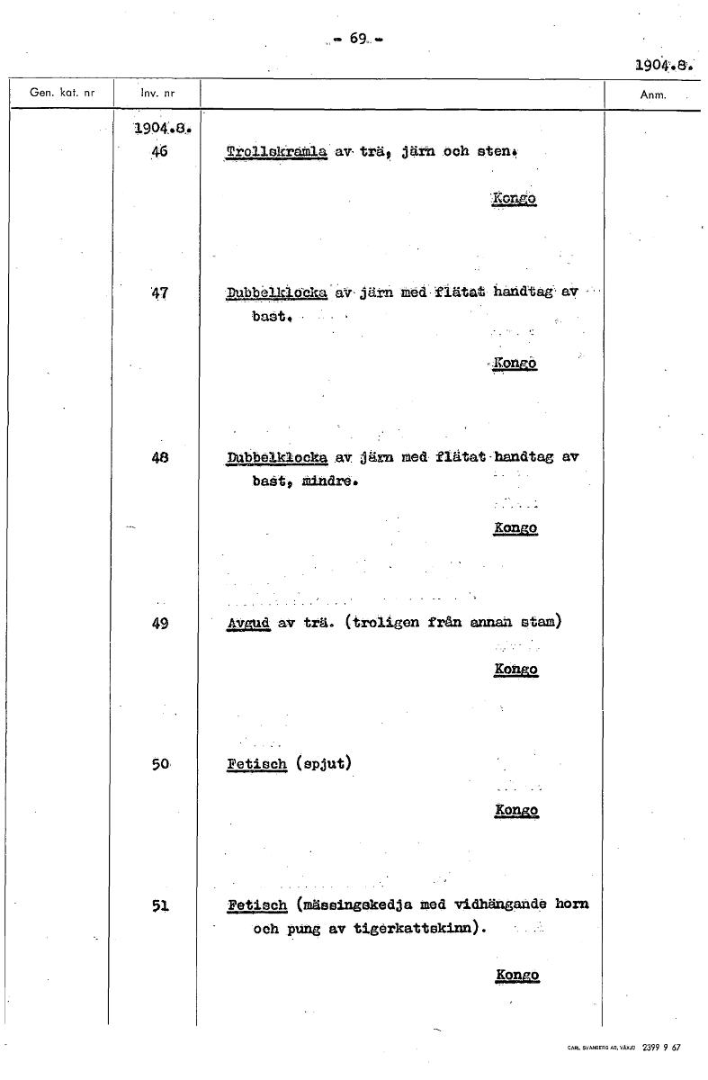 • - 69, 19644ao 46 Trollokrainla av trä, järn och sten: .Kon.,o 47 1221219Ä4329sal t av- järn med flätat handtag. av - bast 48 Dubbalklocka av. järn med flätat-handtag av baat, Mindre. Kongo 49 Avgud av... Visa hela