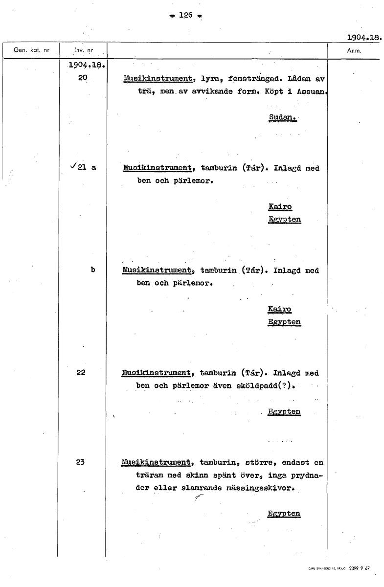 126 1904.186 1904.14. 20 Musikinstrument, lyra, femsträngad. L4dan av trä, men av avvikande form.. Köpt i Aesuan. Sudan. ✓21 a Musikinstrument, tamburin (Tår). Inlagd med ben och pärlemor. Kairo ten b...