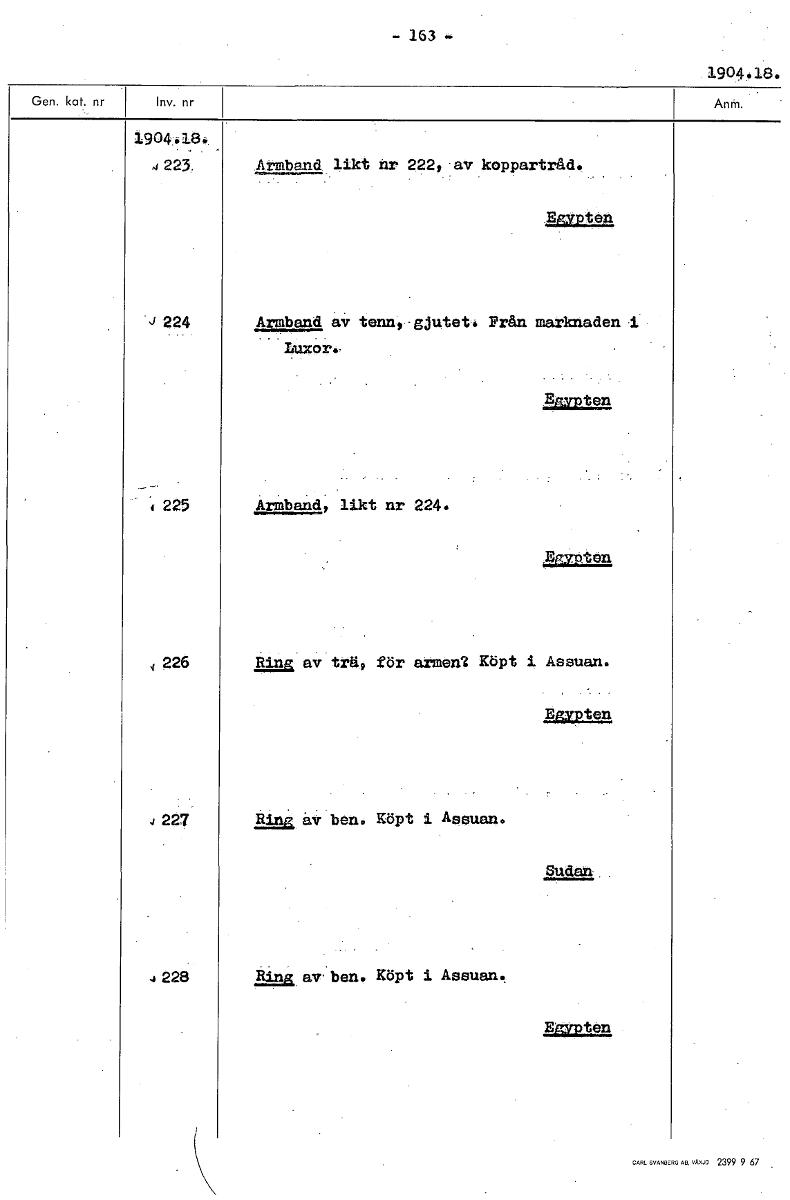 -163- 1904 .18. 4:904:4i18k 223. .urnband likt nr 222, av koppartråd. E4voten J224 Armband av tenn,--gjutet. Från marknaden i Laxon, !AvDten 225 Ärmband, likt nr 224. arptaa <226 Ring av trä, för armen2 Köpt i Amman. Egypten 226.i 227 av ben. Köpt i Astmano Sudan 4228 av: ben. Köpt i Amman. Emroten [ocr]
