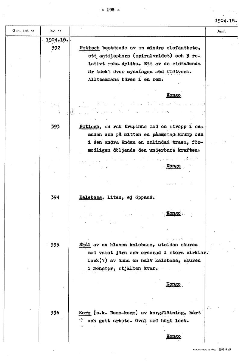• 195 - 1904.18. 1904.19. 392 Petisch, bestående av on mindre elefantbete' ett antilophon (spiralvridet) Och 3 re-.. lativt raka. dylika. Ett av de eietnämnda Ar täckt över mynningen med nätverk. Alltsammans bäres i en rem. Kongo 393 Petisch, en rak träpinne med enetropp i ena ändan och på mitten en påssetatKklump och i den andra ändan en omlindad trasa, för- modligen döljande den underbara kraften: Kongo 394 Kalebass, liten, ej öppnad. -Kongo 395 Skål av en kluven kalebase, utsidan skuren med vasst järn och ornerad i stora cirkla Lock(?) av ännu en halv kalebass, skuren i mönster, stjälken kvar. 396 Köril (s.k. Bonn-korg) av korgflätning, hårt och gott arbete. Oval med högt lock.- [ocr]
