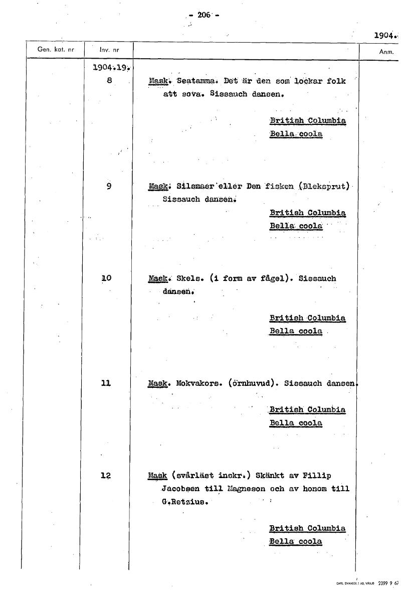 - 206 - 1904 1904,19:. 8 Mask, Seatamma. Det är den som loCkar folk att sova. Sissauch dansen. British Columbia Bella coola Mask, Silsmasr'eller Den fisken (Bleksprut) Sissauch dansen, British Columbia Bellaucoola 10 Skels. (i form av fågel). Sissauch dansen. British Columbia Bella (molo; 11 Mask. Mokvakors. (örnhuvud). Siesauch dansen British. Columbia Bella coola 12 Mask (svårläst inskr.) Skänkt av Pillip Jacobsen till Magneson och av honom till G.Retzius. British Columbia Bella coola [ocr]Stäng