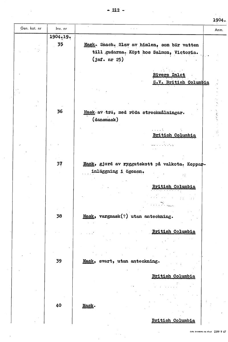 ,212 - 1904. 190419. 35 Mask.. Snach.,,Uav av himlen, som bär vatten till,gudarna.. Köpt hos Salmon, Victoria. (jmf. nr 25) Rivers Inlet • S.V. British Colum ia 36 Mask.alk•trä, med röda streckmålningar. (dansmask) British Columbia 37 Mask, gjord av ryggutskott på valkota. Kopp inläggning i. ögonen. British Columbia 38 Mask, vargmask(?) utan anteckning. British Columbia 39 Mask, svart, utan anteckning. British Columbia 40 Mask. British Columbia [ocr]