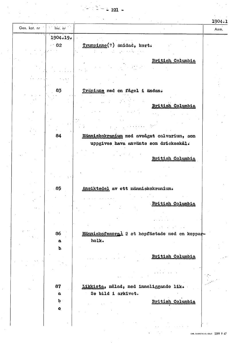 • = 221 = 1904.1 2.904.19.- 82 rumpinne(?) snidad, kort aritish Columbia 3 ZgäLtnamed en fågel i ändan. Columbia 84 Människokranium med avsågat ealvarium, som uppgives hava använts som drieksskålå, Brit... Visa hela