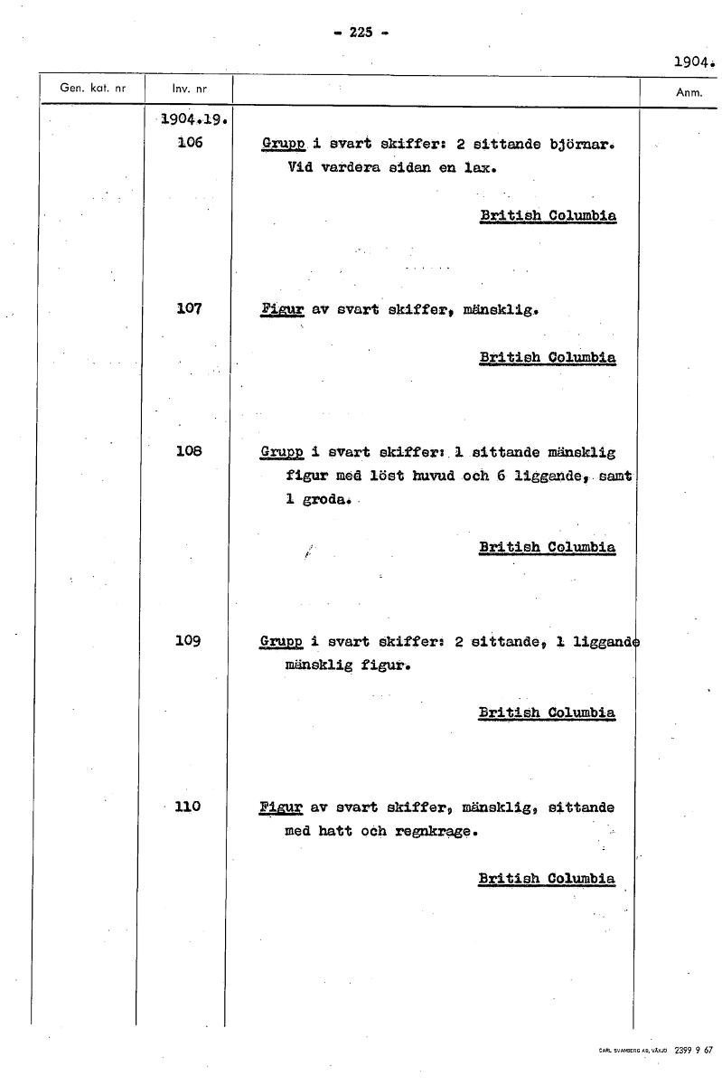 - 225 - 1904. 1904.19. 106 Grupp, i svart skiffer: 2 sittande björnar. Vid vardera Sidan en lax. British Columbia 107 Pigur av svart skiffer, mänsklig. British Columbia 108 Grupp i svart skiffers .1 s...Visa hela