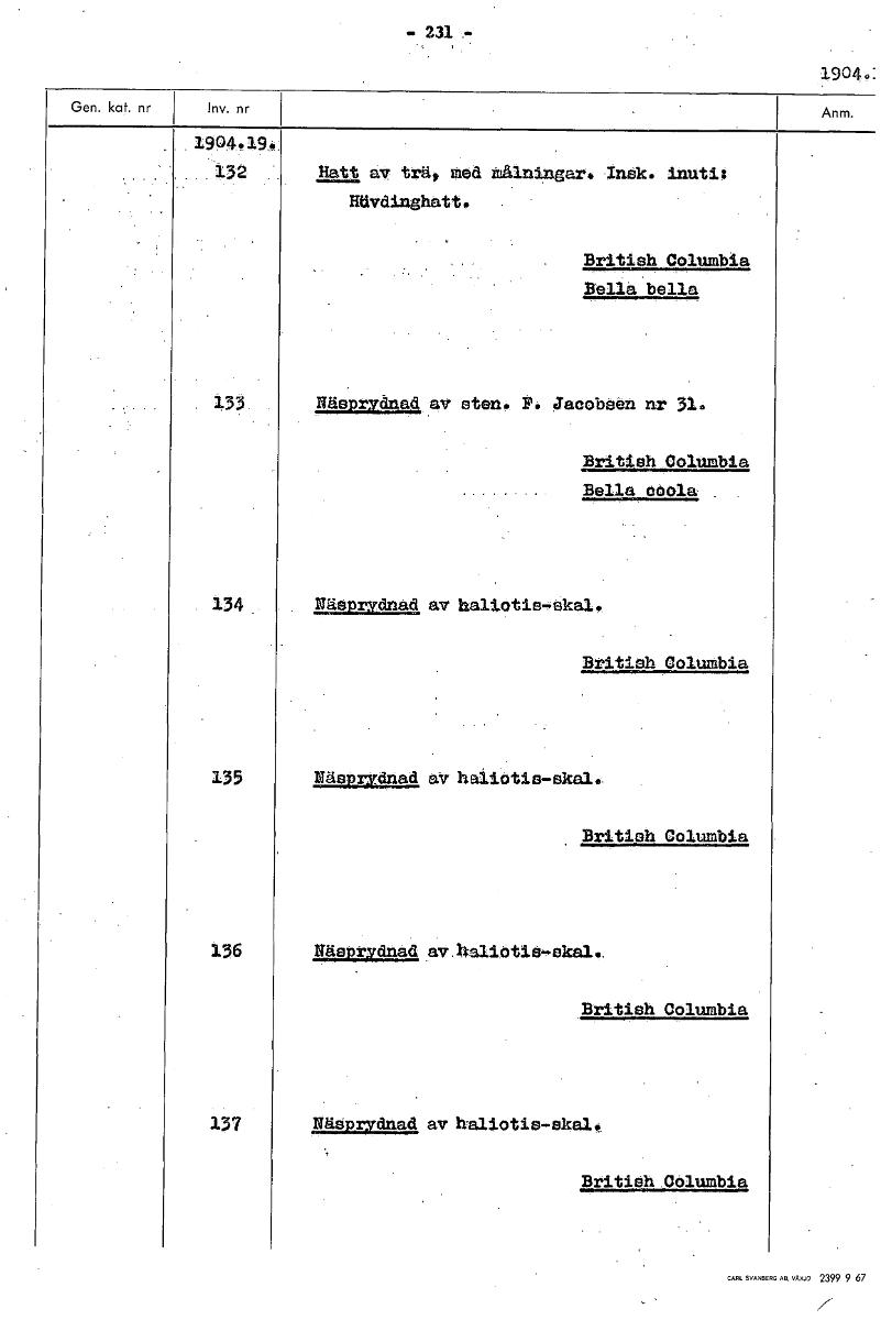 • - 231 - 19o4.: 1594.19A : 132 tt av trä, med målningar* Inek. inuti: Hävdinghatti British Columbia Bella bella 133 Näsprydnad av sten. P. Jacobsen nr 31. British Columbia Bella eoola 134 Näsprydnad av... Visa hela