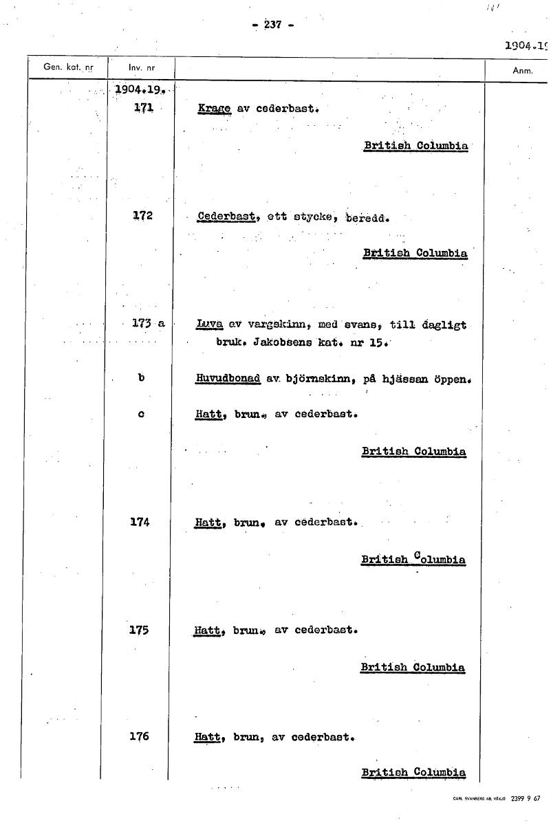 • - 237 - 1904.1f 1904,19.. 171 ' Krage. av cederbast. Britieh Columbia 172 Cederbast, ett stycke, beredd. British Columbia 173a Luva av vargskinn, med svans, till dagligt bruk. Jakobsens kat, nr 15. b ... Visa hela