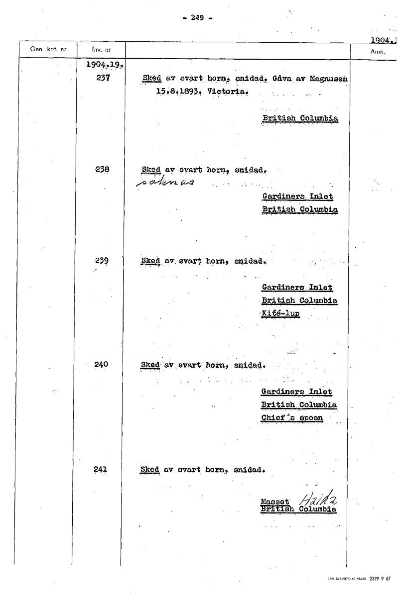 - 249 - 1904. 1904,49, 237 Skd av SvarOrn., Snidad. Gåva. av Magnusen 15,8 .1893, Victoria. .134444 Columbia 238 pilema av svart hornp Onidad. Gardiners Inlet, British Columbia 239 424 av. svart horni...