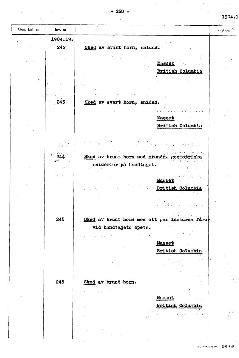 • 4.250 - 1904.19. 242 Sked av svart horn, Snidad. Masset British Columbia 243 Sked av svart horn, snidad. Masset British Columbia . . , 244 Sked av brunt horn med grunda, geometriska sniderier pä handt... Visa hela