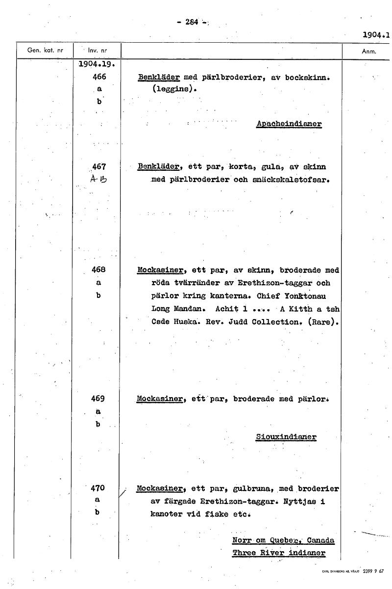 - 284 1904.1 1904.19. 466 Benkläder med pärlbroderier, av bockskinn. a (leggins). b Apacheindianer ..467 • Benkläder, ett par, korta, gula, av skinn A-6 med pärlbroderier och anäckskalåtcfsar. 468 Mockasiner, ett par, av skinn, broderade med a röda tvärränder av Erethizon-taggar och b pärlor kring kanterna. Chief YonktOnau Long Fandan. Achit 1 .... A Kitth a tsh Csde Ruska. Rev. Judd Collection. (Rare). 469 Mockasiner, eit'par, broderade med pärlor. . a b SiOuXindianer ' 470 Mockasiner, ett par, gulbruna,.med.broderier a av färgade Erethizon-taggar. Nyttja0 i b kanoter vid fieke etc. Norr om Quebe4i Canada Three River indianer [ocr]