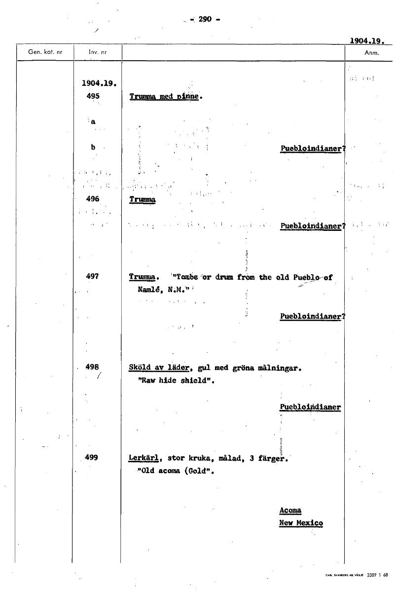 • 290 1904.19. 1904.19. 495 Zrufflaaed...62A£. Puebloindianer 496 Puebloindianer 49? Trumma. 41Tombe-tr dram frOm the old Pueblo-of Namid, Puebloindianer . 498 Sköld av läder, gul med gröna målningar. "... Visa hela