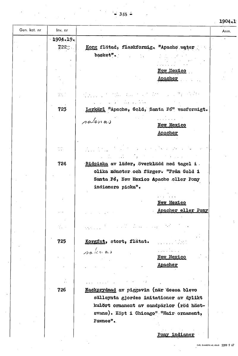 =335 =. 190411 499449,, Keta flätad, fiaskförmi "APachamater basket" New Mexico Apacher 723 Lerkärl "Apache Gold, Santa Pd" vasformigt. New Mexico 1122111£ 724 äljaglga av läder, Emerklädd med tagel i. olika mönster och färger. "Från Gold i Santa 145, New Mexico Apache 411er Pony indianers piska", New Mexico Apacher eller Pony 725 Korgfat, stort, flätat. . „ New Mexico Apacher 726 Nackprydnad av Piggsvin <när 'dessa blev° sällsynta gjordes imitationer av dylikt kulört ornament av sandpärlor (röd häst- svans). Köpt i Chicago"-"Sair ornament, Pawnee". Pony indianer [ocr]