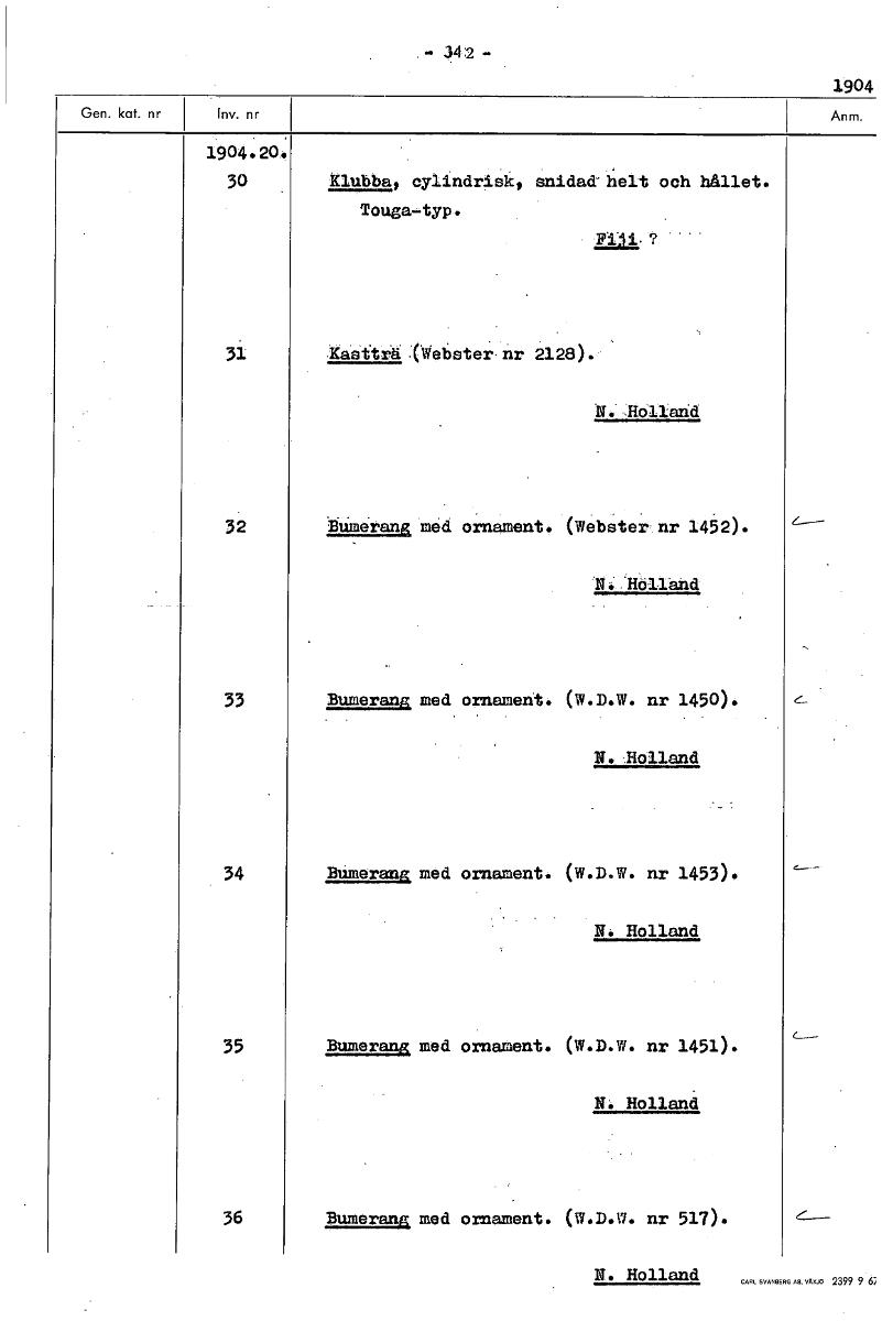 • • 34.2 1904 1904.20.. 30 klubba, cylindrisk, snidad helt och hållet. Touga«.-typ. 31 kasiträ .(Webster nr 2128). 32 ;Bumerang, med ornament. (Webster nr 1452). ..Hölland 33 Bumerang, med ornament. (W.... Visa hela