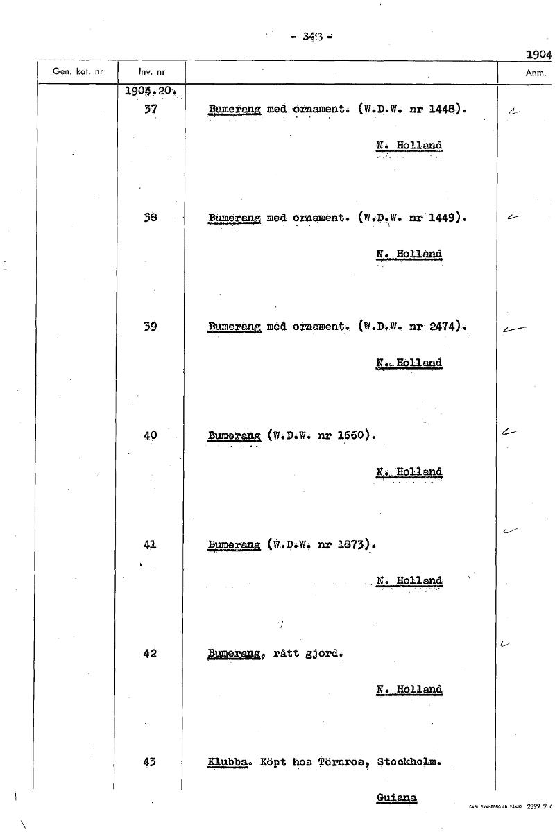 • 349 1904 1904.20. 37 Bumerang med ornament. (W.D.W. nr 1448). N. Holland 38 Bume ang med ornament. (tff‘P.W. nr 1449)- N. Holland 39 Bumerang med ornament. (W.D.W. nr 2474). N., Holland 40 Bumerang (W... Visa hela