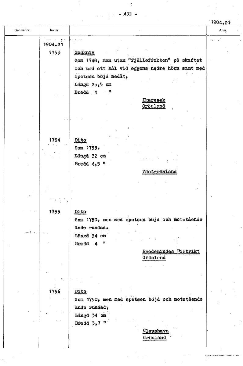 - 432 1904.21 1904.21 1753 Snökniv Som 1748, men utan fjälieffekten" på skaftet och med ett hål Vid eggens nedre hörn samt med' Spetsen böjd nedåt.. Längd 25,5 cm Bredd 4 " Ikaresak Grönland 1754 Dito...Visa hela