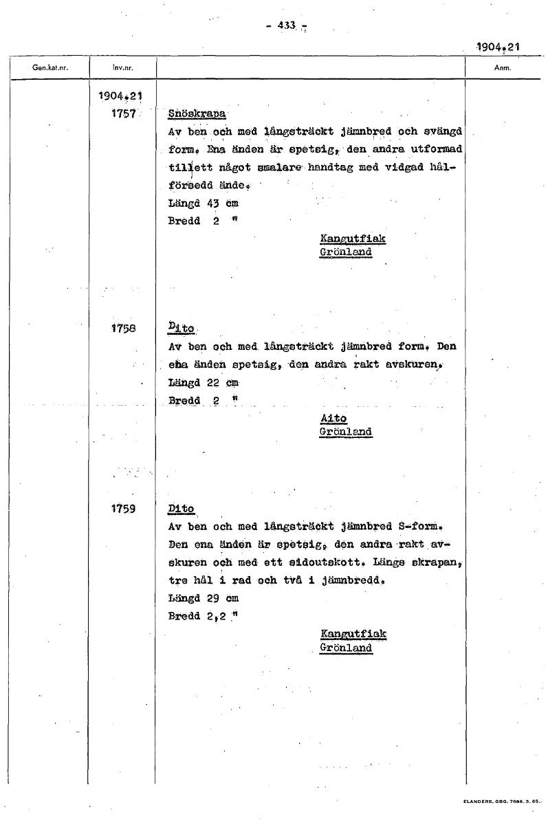 - 433 .7 1904,21 1904.21 1757 Snöskrapa Av ben och med 14ageträckt jämnbred och svängd forn 9 Ena änden är spetsig,: den andra utformad tillett något ema4Are handtag med vidgad hål- försedd ände0- Län...