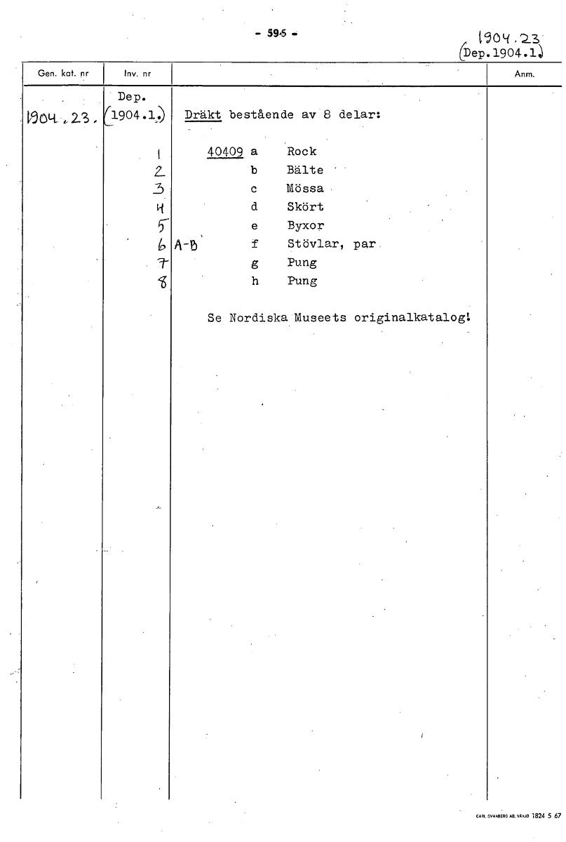 • 59,5 t 9 o . CDep.1904.4 Dep. 31)(4 23, 01904.1) Dräkt bestående av 8 delar: 40409 a Rock 2_ b Bälte 3 c Mössa H d Skört e Byxor 6 A-5 f Stövlar, par. g Pung h Pung Se Nordiska Museets originalkatalog... Visa hela